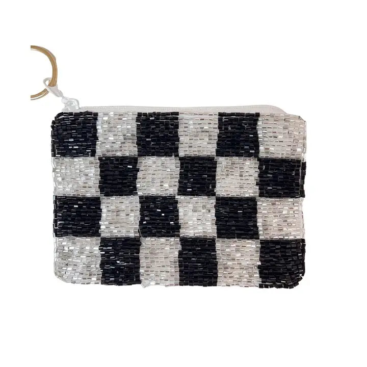 Checkered Black/Silver Keychain Pouch. This hand-beaded accessory is not only a stylish choice, but it also serves a practical purpose. Compact yet spacious enough to hold your essentials, this keychain pouch is perfect for those who appreciate functionality and unique design.