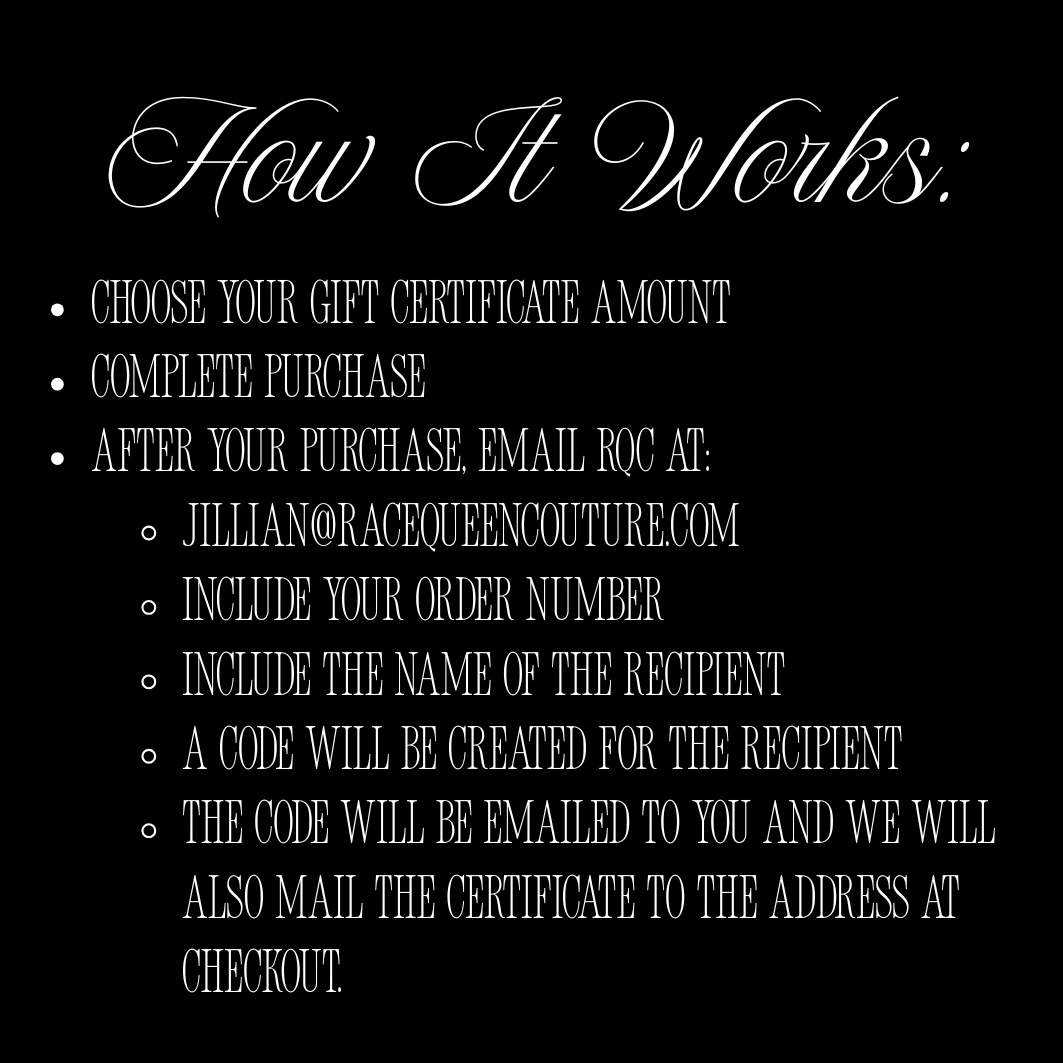 When in doubt, choose Couture ... Race Queen Couture! Our RQC Gift Certificates are always the perfect choice for ladies who live life in the fast lane.